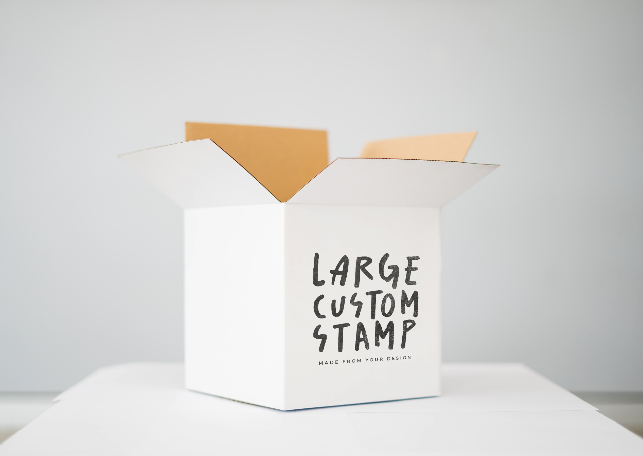 - Large logo stamps work well on paper, cardstock, kraft packaging, envelopes, cardboard boxes, and paper bags. For non-porous surfaces such as plastic, metal, or glass, a specialist ink is required.