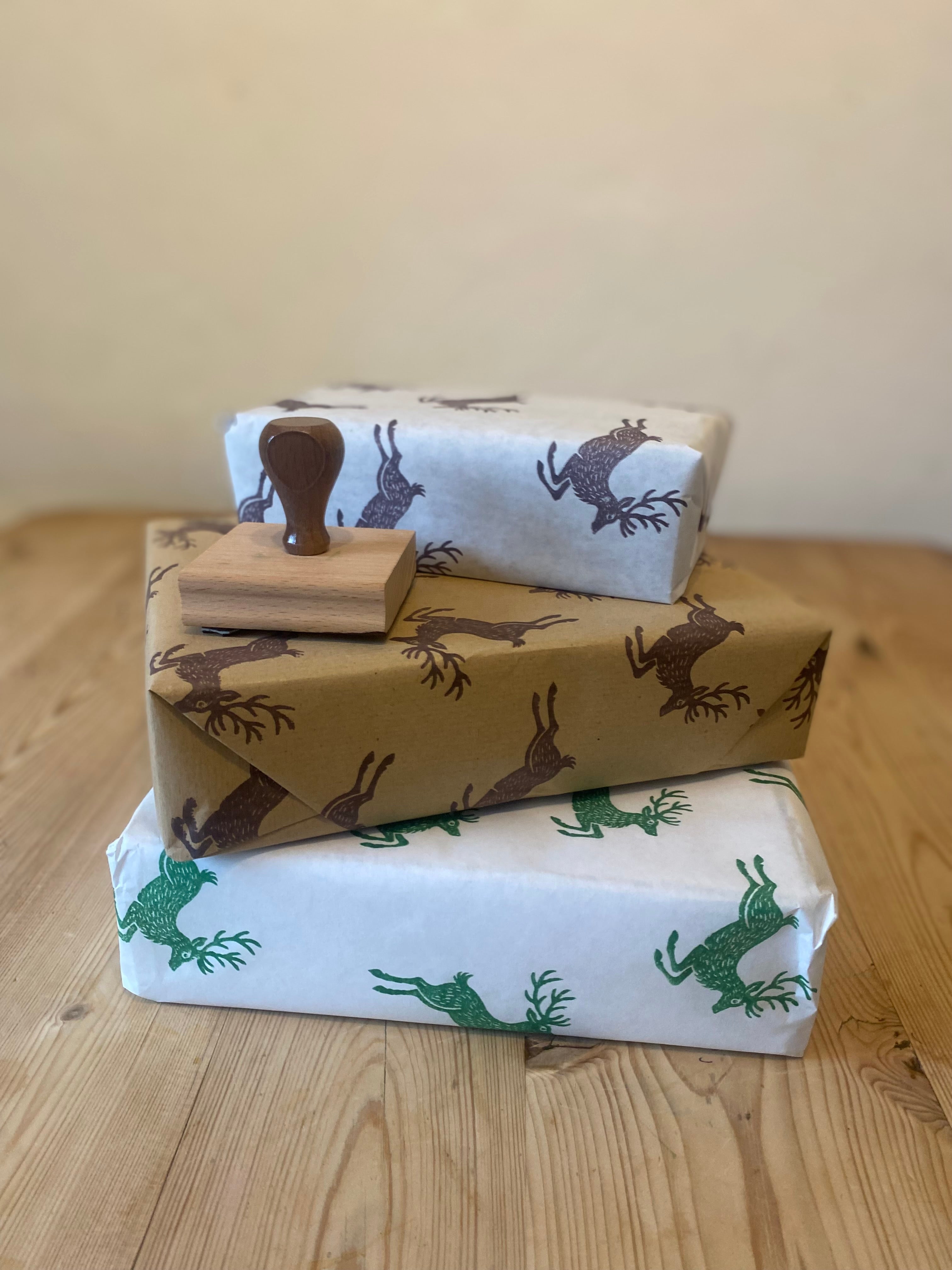 This reindeer rubber stamp is basically Rudolph’s artsy cousin — carved in a linocut style to give your Christmas cards, wrapping & gift tags that perfectly imperfect handmade feel. Whether he’s prancing across wrapping paper or standing proudly on a postcard, this deer adds just the right touch of woodland magic (no sleigh required).